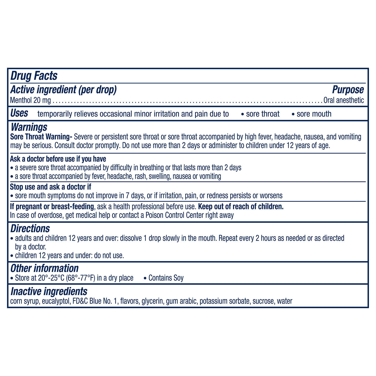 Active Ingredient (per drop): Menthol 20 mg Inactive Ingredients: Corn Syrup, Eucalyptol, FD&C Blue No. 1, Flavors, Glycerin, Gum Arabic, Potassium Sorbate, Sucrose, Wate