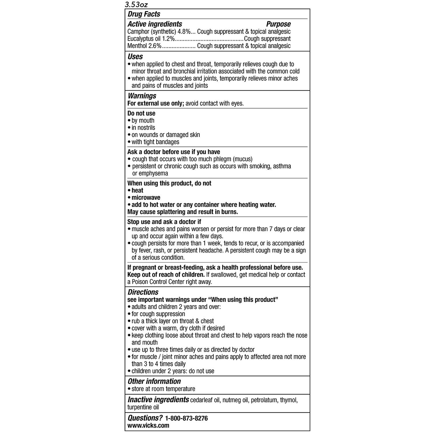 Vicks VapoRub Cough Suppressant Topical Analgesic Ointment provides relief for your cough, muscle aches and pain for up to 8 hours. Anyone aged two years and older can use Vicks VapoRub for their relief.