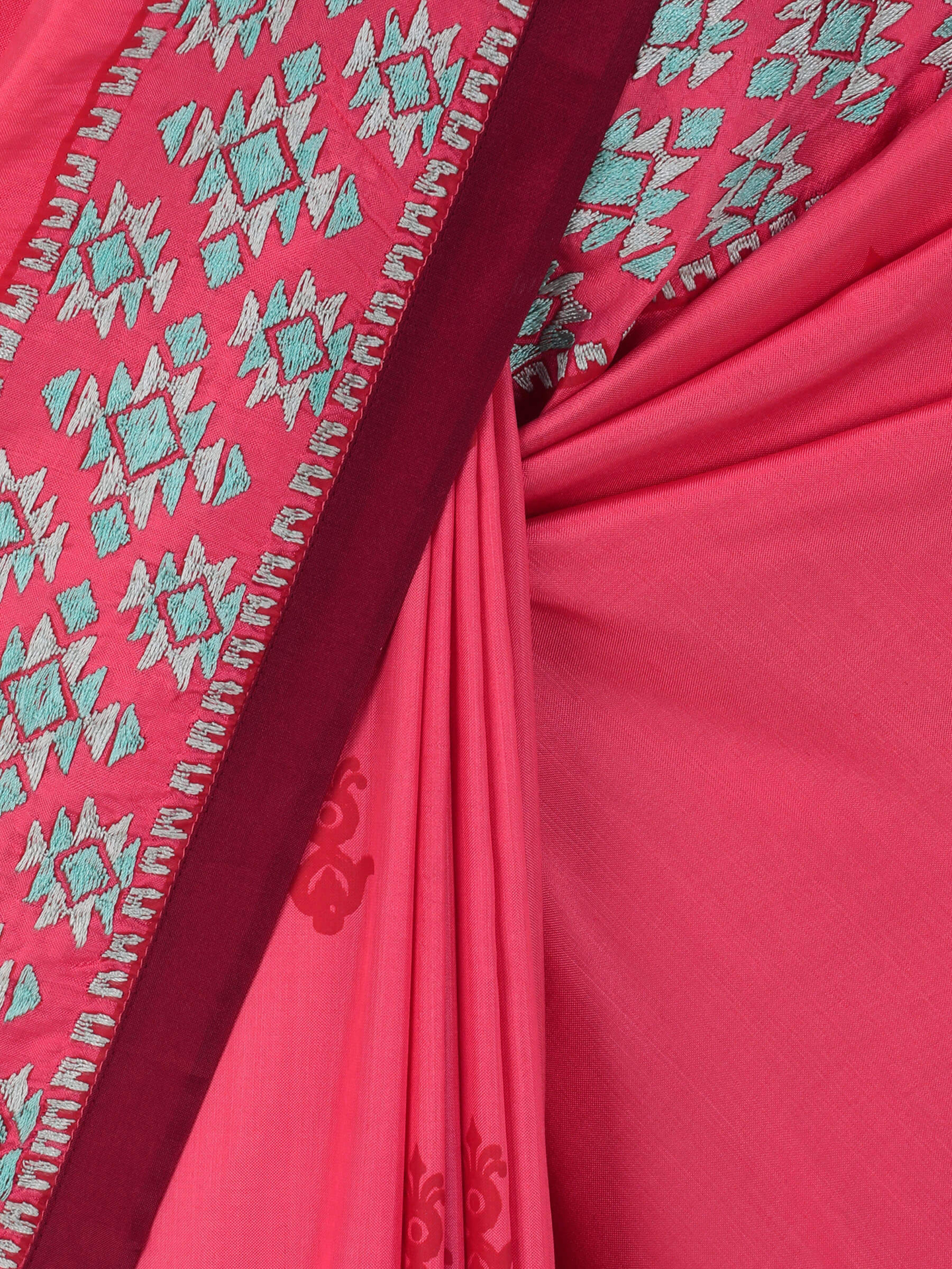 Watermelon silk saree with red print and turquoise Nakshi kantha embroidery. Aanchal with tassel trim. Comes with unstitched blouse piece.