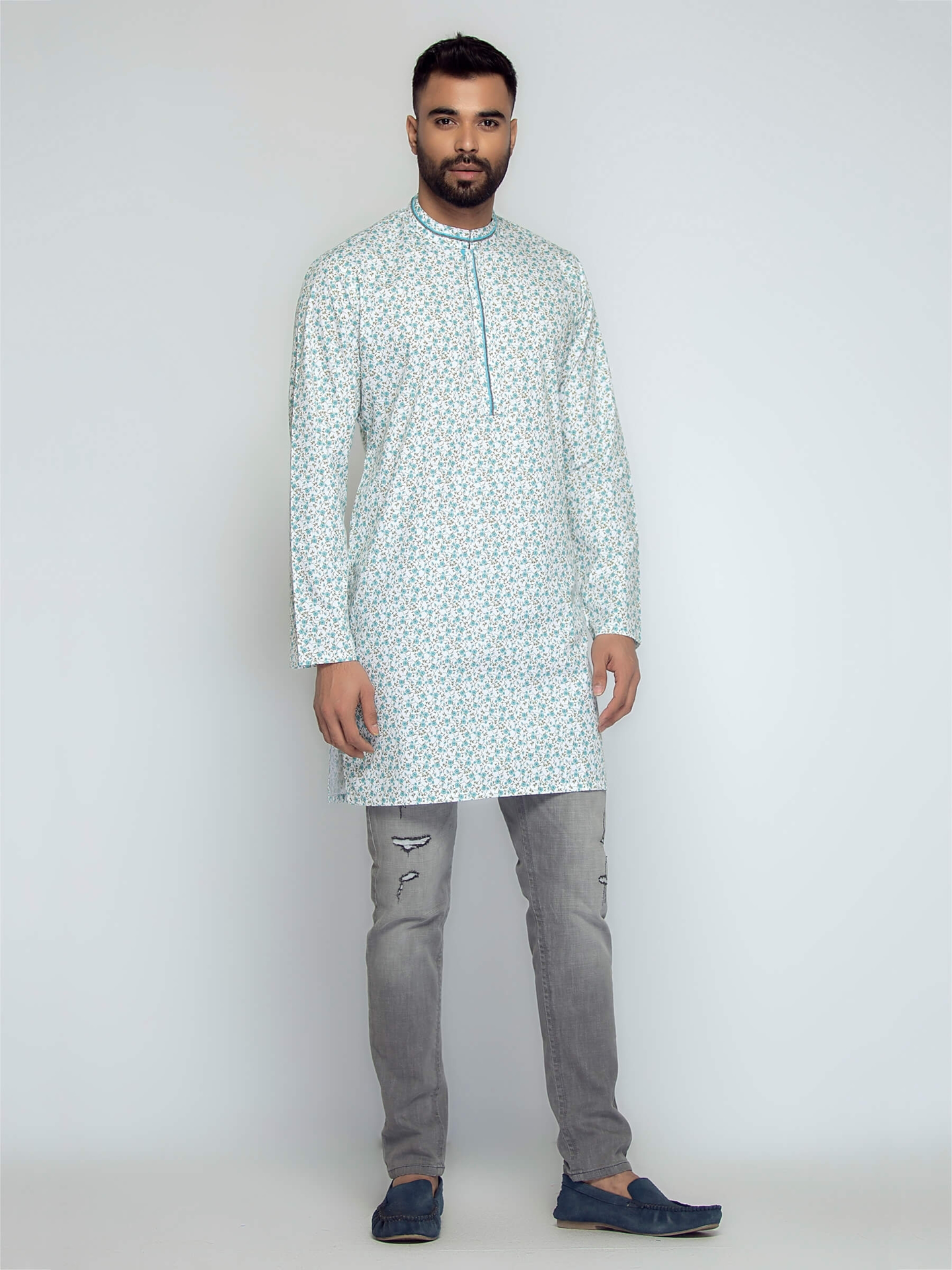 White printed slim fit cotton short kurta. this kurta useing very comfortable. made in bangladesh.