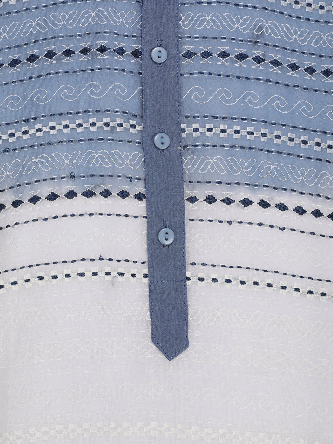 White printed cotton panjabi with embroidery and blue ombre dyeing. Features in-seam side pockets. Pair with pajama, waistcoat and other accessories.