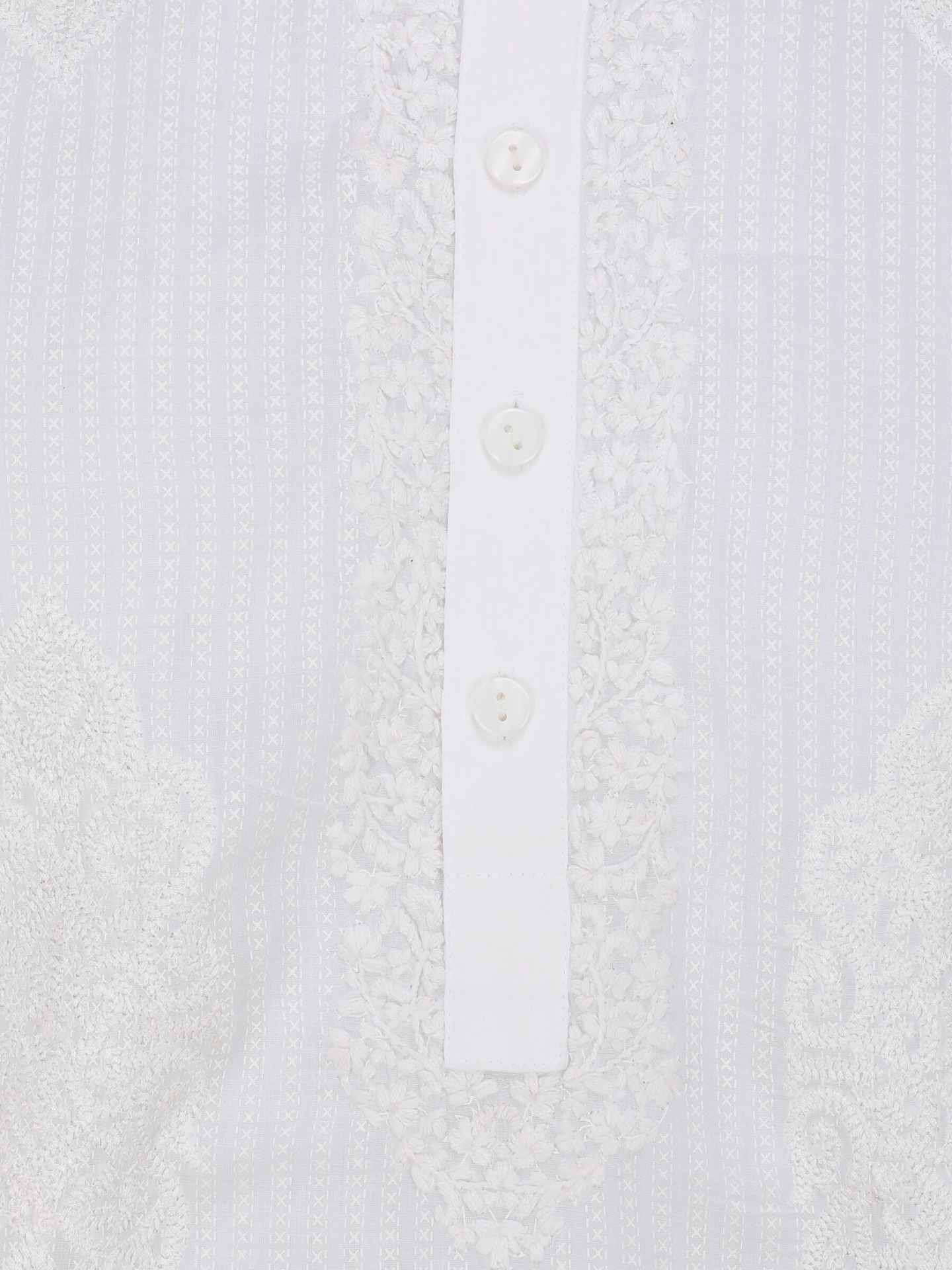 White addi cotton panjabi with green and brown embroidery, white prints and weaving.