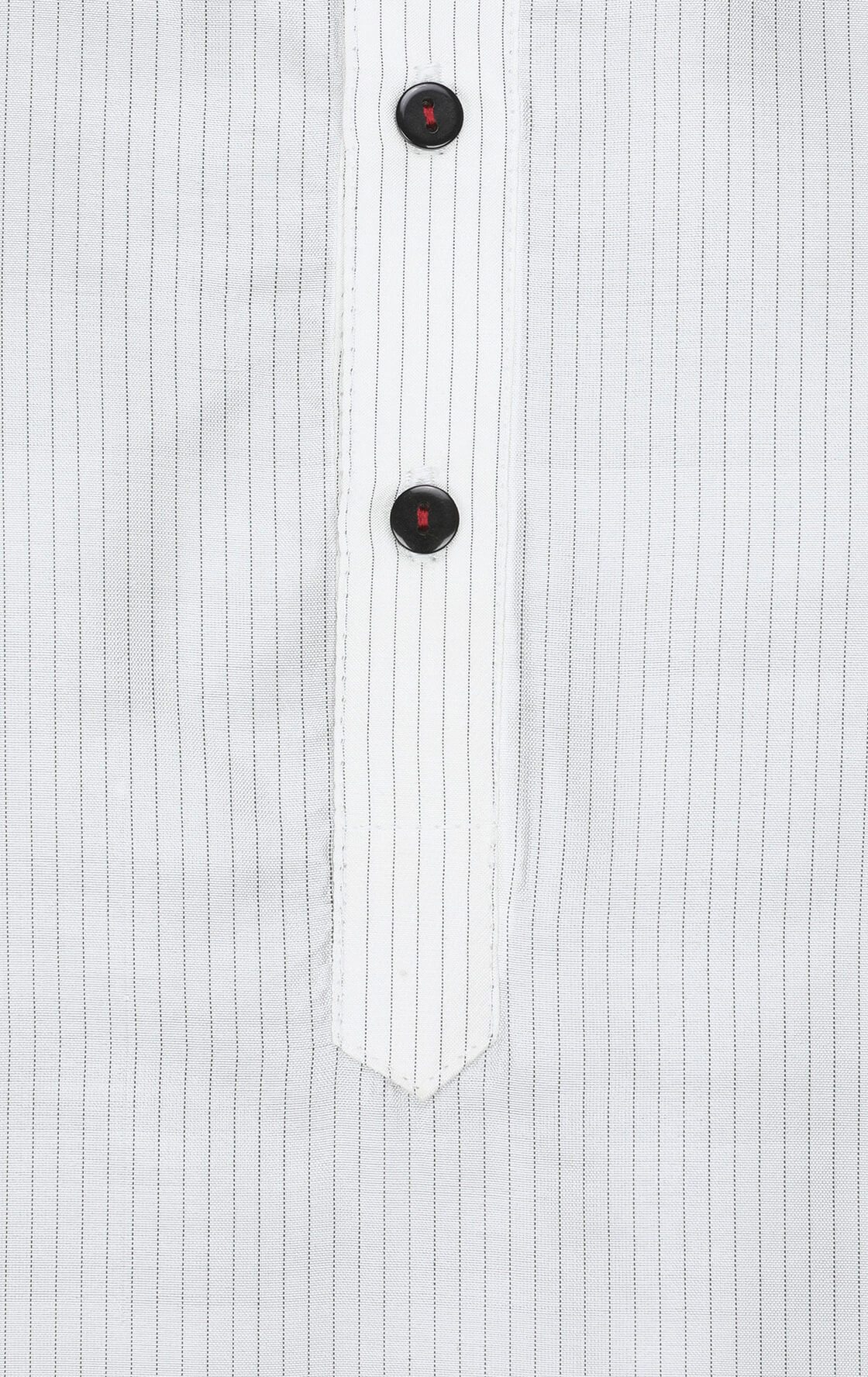 White pinstriped silk panjabi with black embroidery. Comes with white cotton pajama. this panjabi useing very comfortable. made in bangladesh.