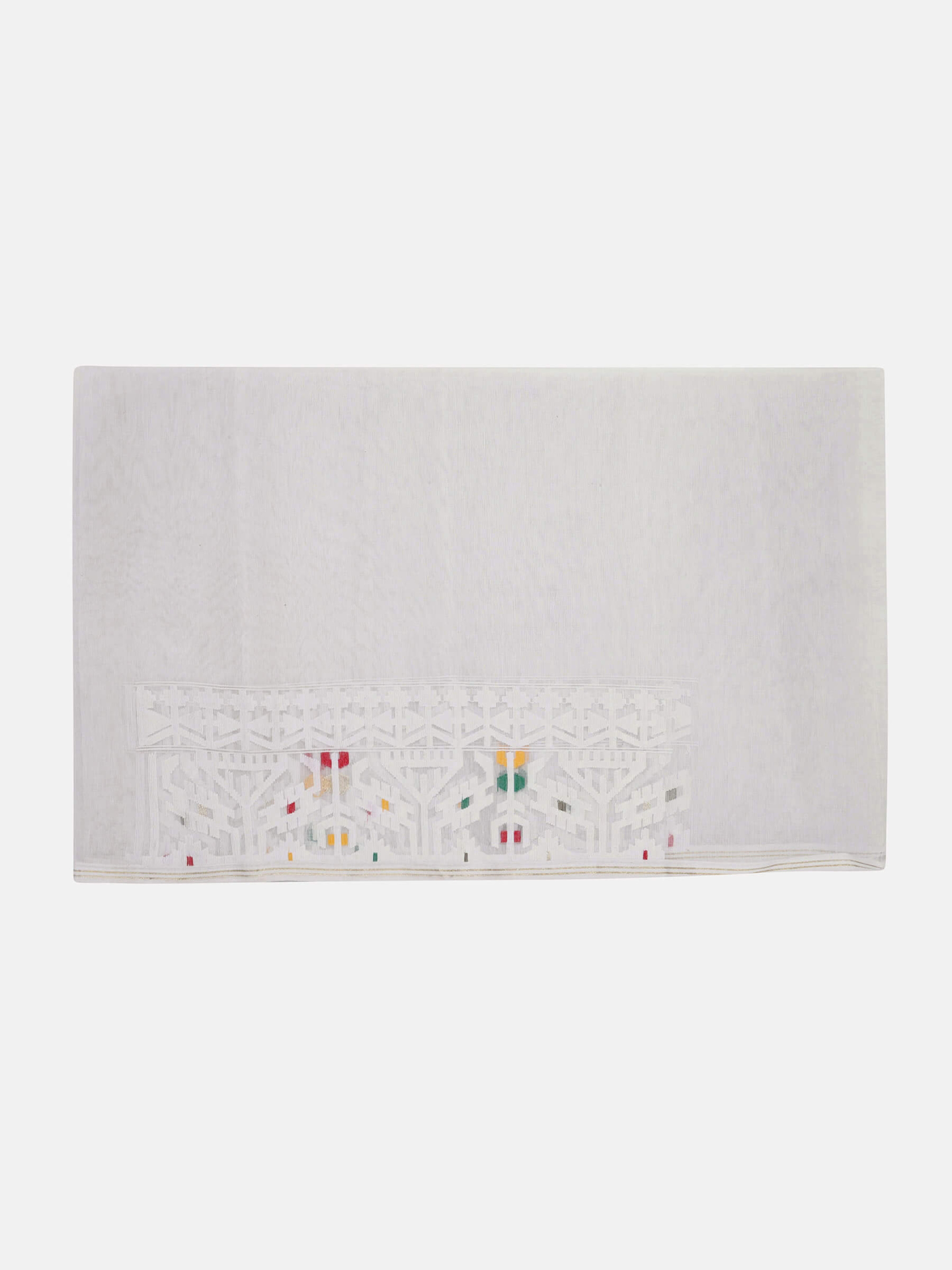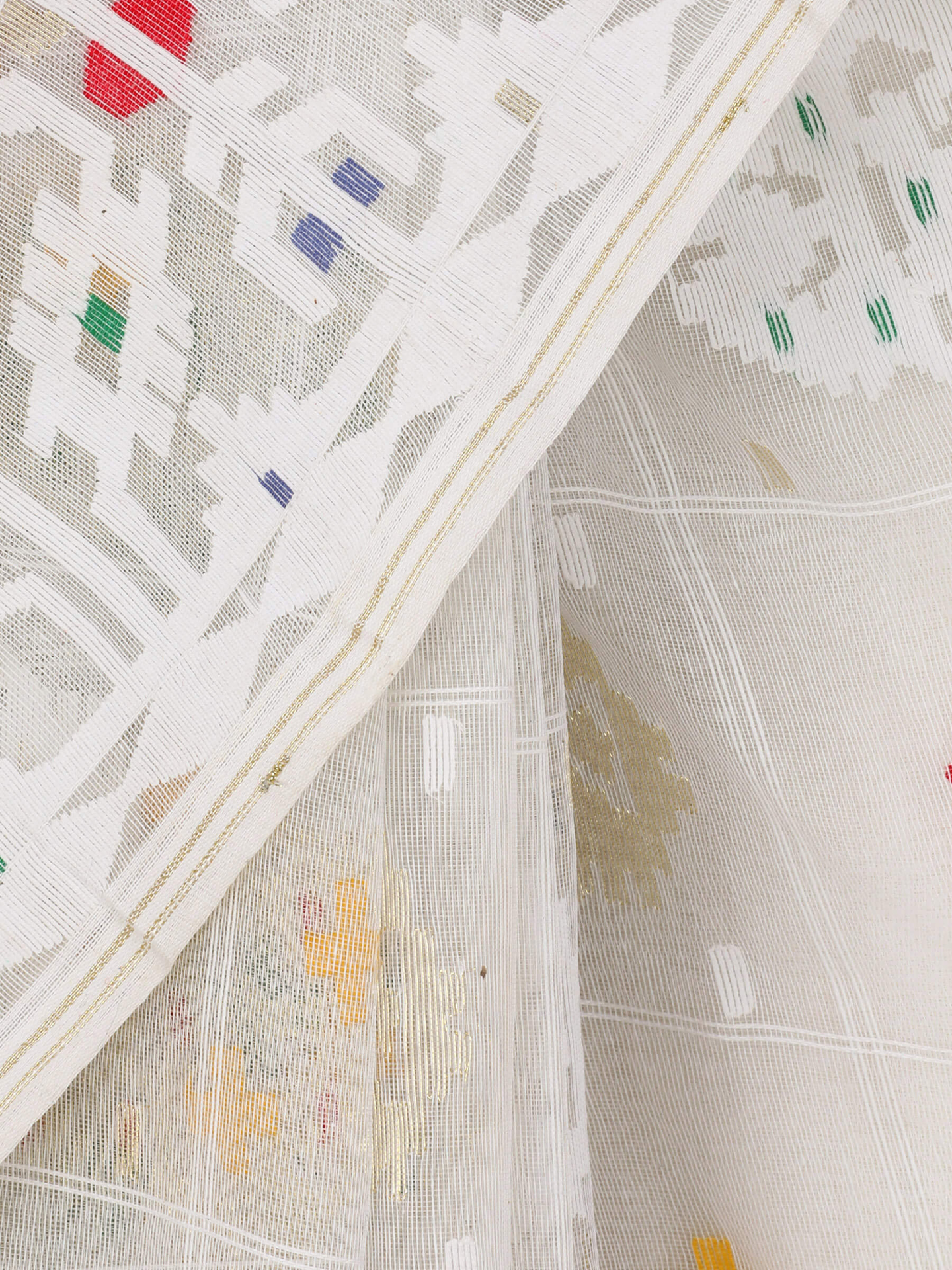 White half silk jamdani saree with white, green, blue and mustard buti. Comes with matching separate unstitched blouse piece.