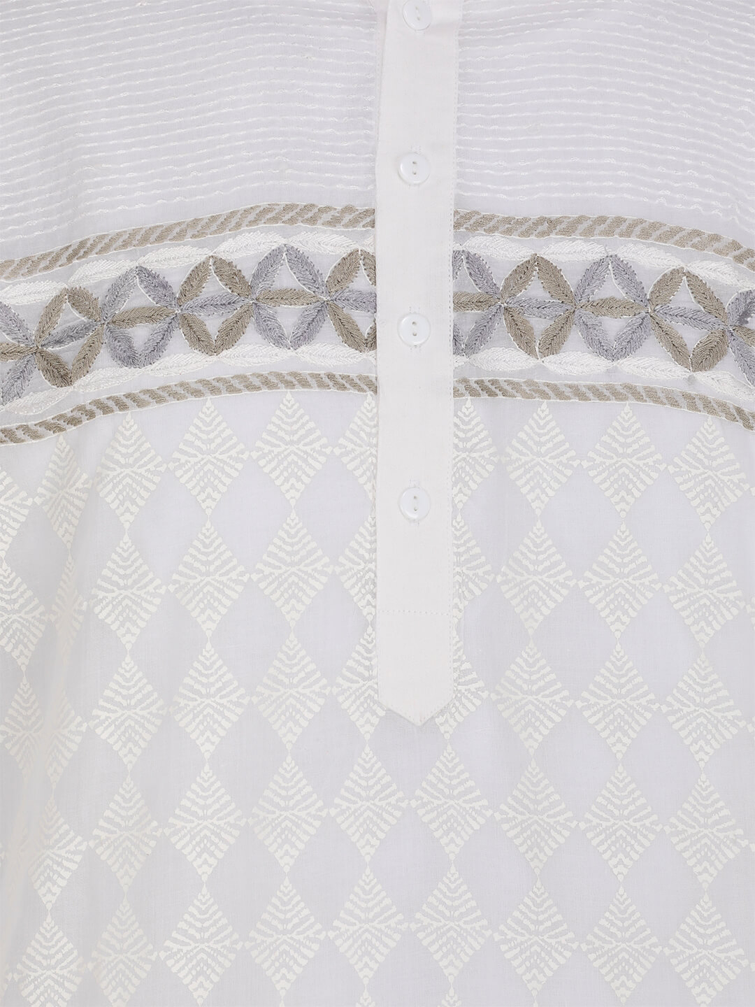 White printed addi cotton panjabi with brown and grey embroidery. Features in-seam side pockets. Pair with pajama, waistcoat and other accessories.