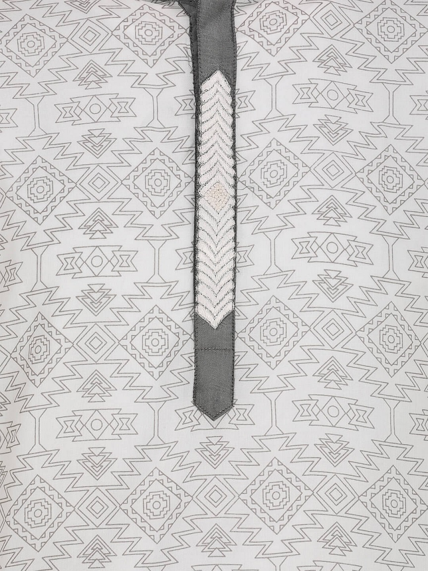 White addi cotton panjabi with ivory and grey embroidery over white prints.