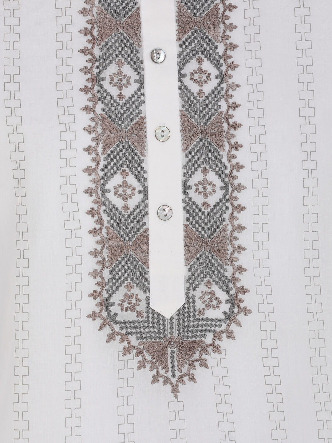 White printed addi cotton panjabi with grey embroidery. Features in-seam side pockets. Pair with pajama, waistcoat and other accessories.