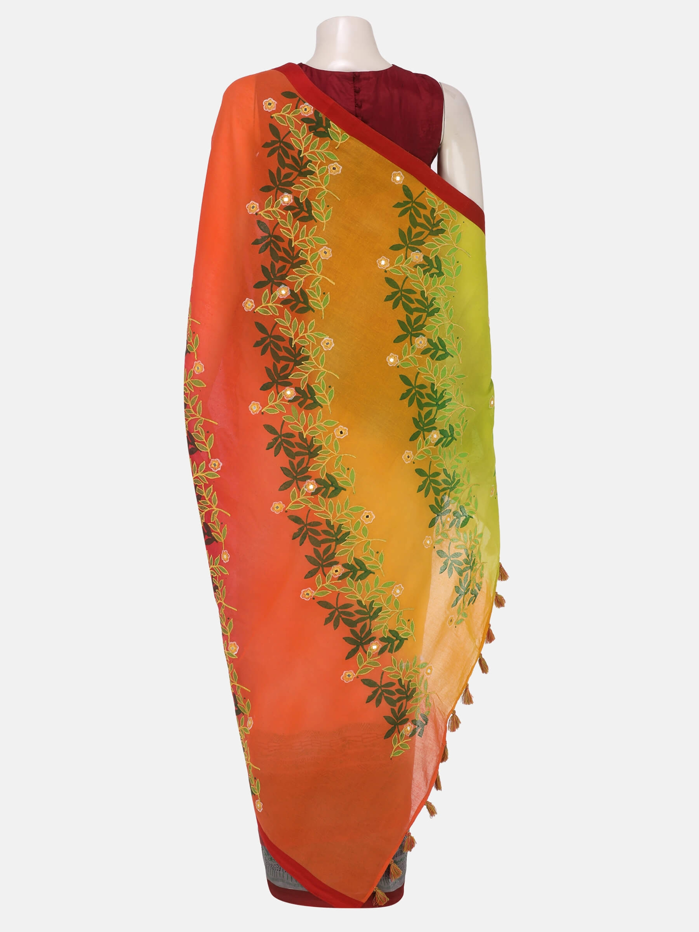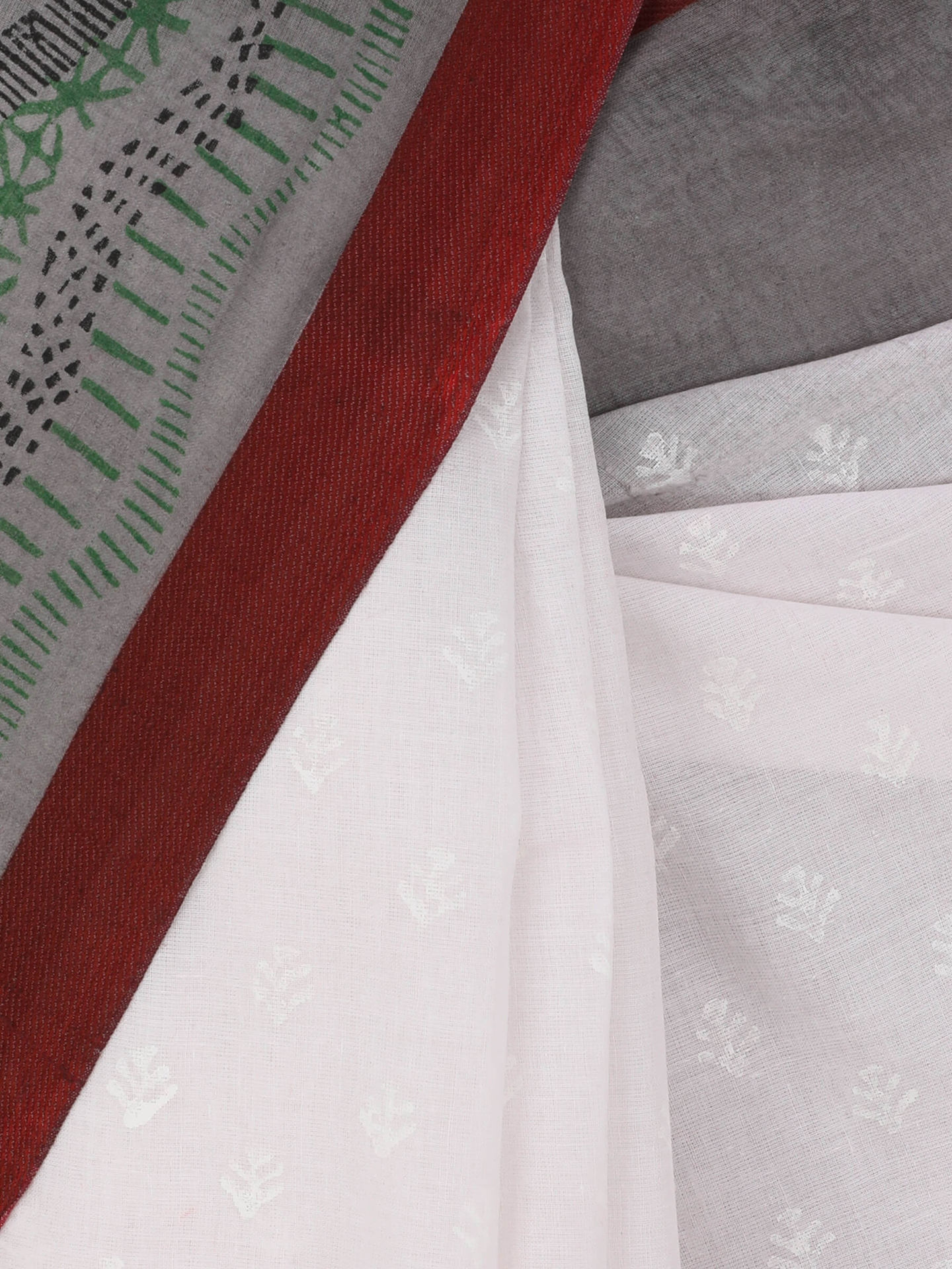 White cotton saree with multicolour spray print and embroidery. Aanchal with tassel trim. Comes with matching unstitched blouse piece.