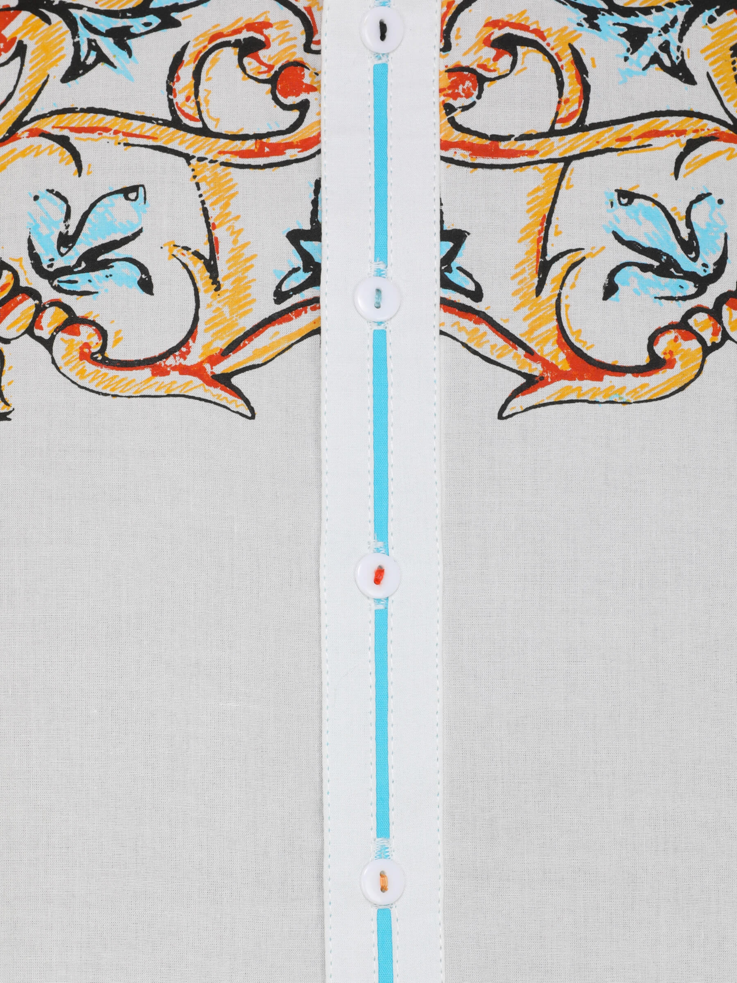 White viscose-cotton slim fit panjabi with multicolour prints. this panjabi useing very comfortable. made in bangladesh