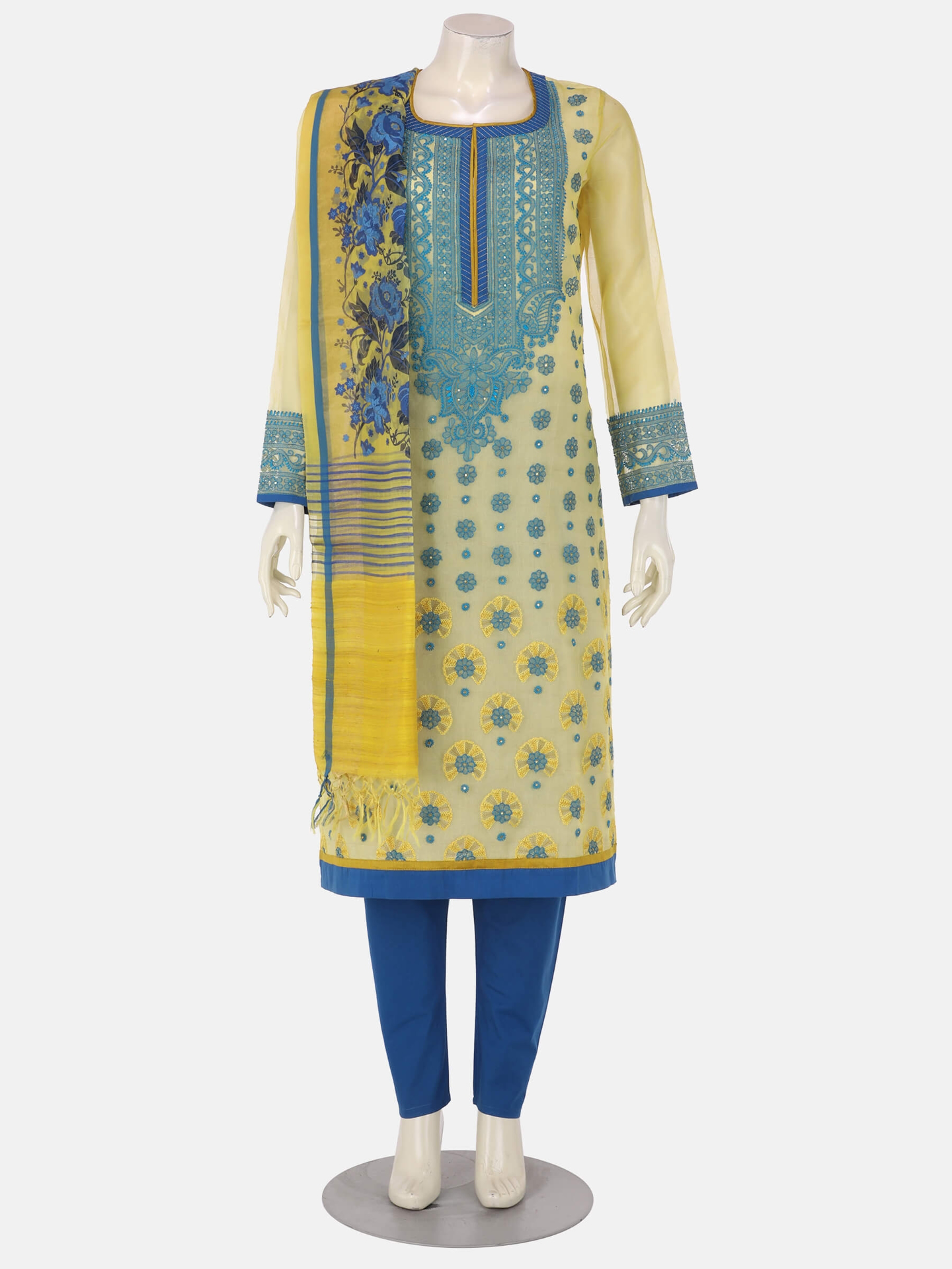 Yellow muslin kameez with blue and yellow embroidery. Comes with silk-cotton shalwar and printed endi muslin dupatta.