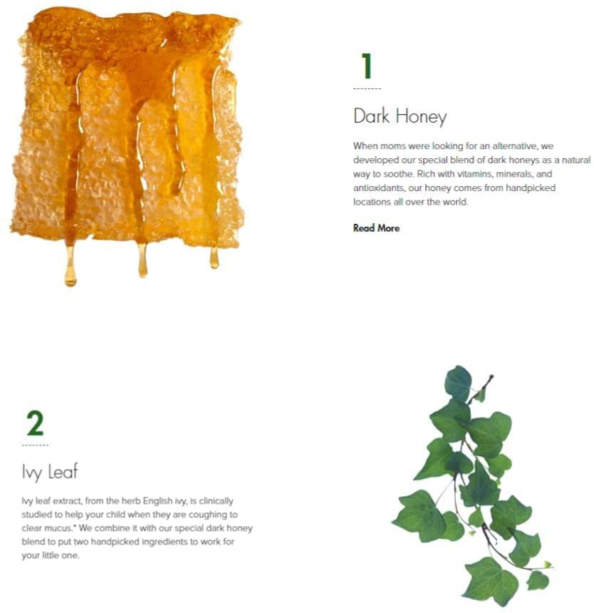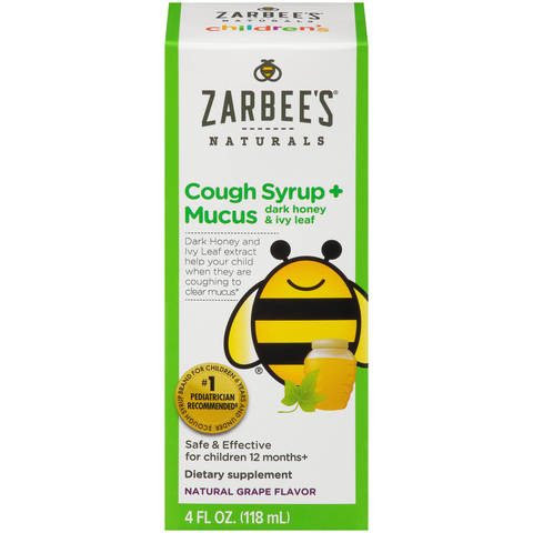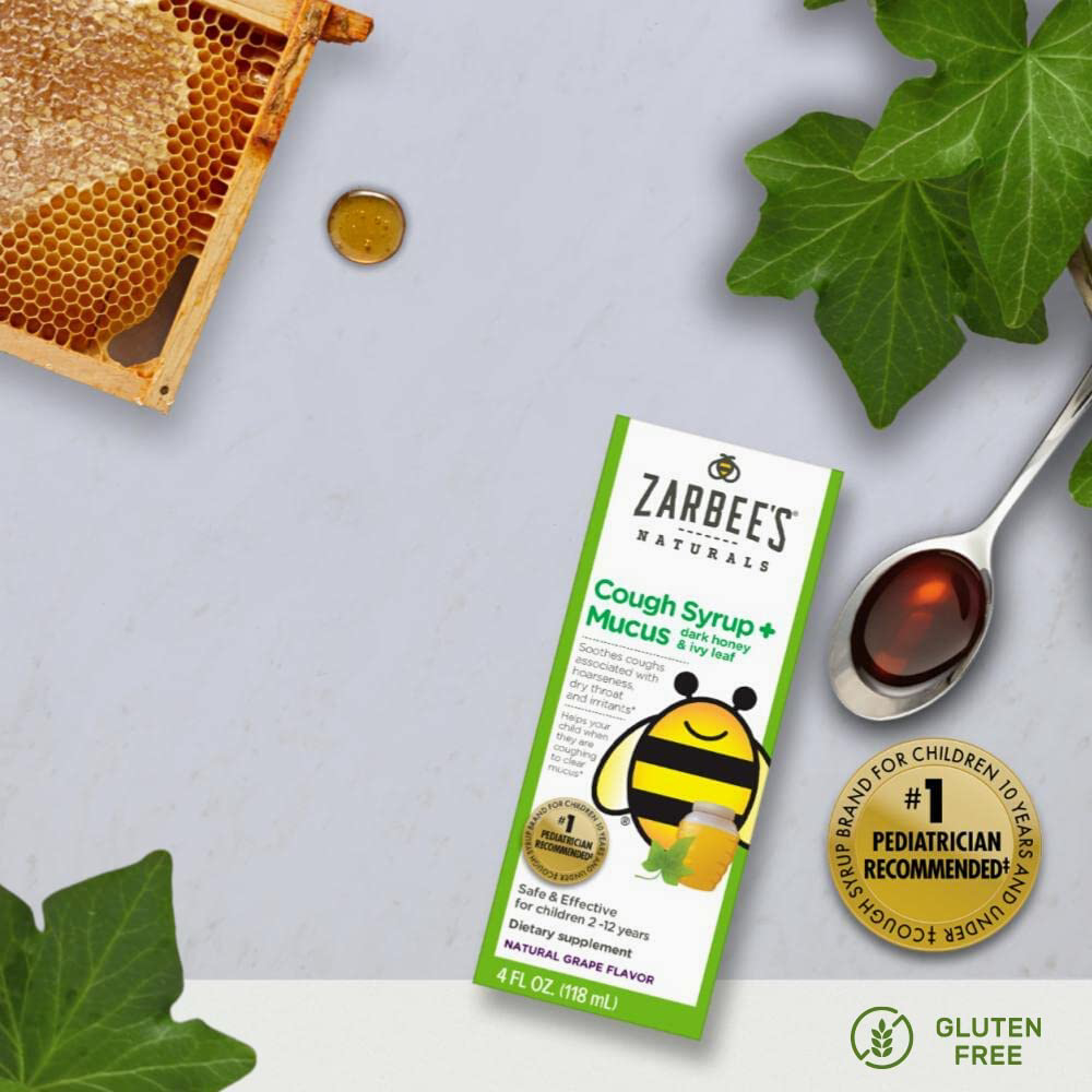 Using natural ingredients and natural grape flavor, Zarbee's cough syrups contain no alcohol, drugs, artificial sweeteners, artificial flavors or dyes. They are also gluten-free. Zarbee's Cough Syrup + Mucus products are made with a proprietary blend of natural dark honey for coating and soothing the throat and English ivy leaf extract to help to clear mucus.